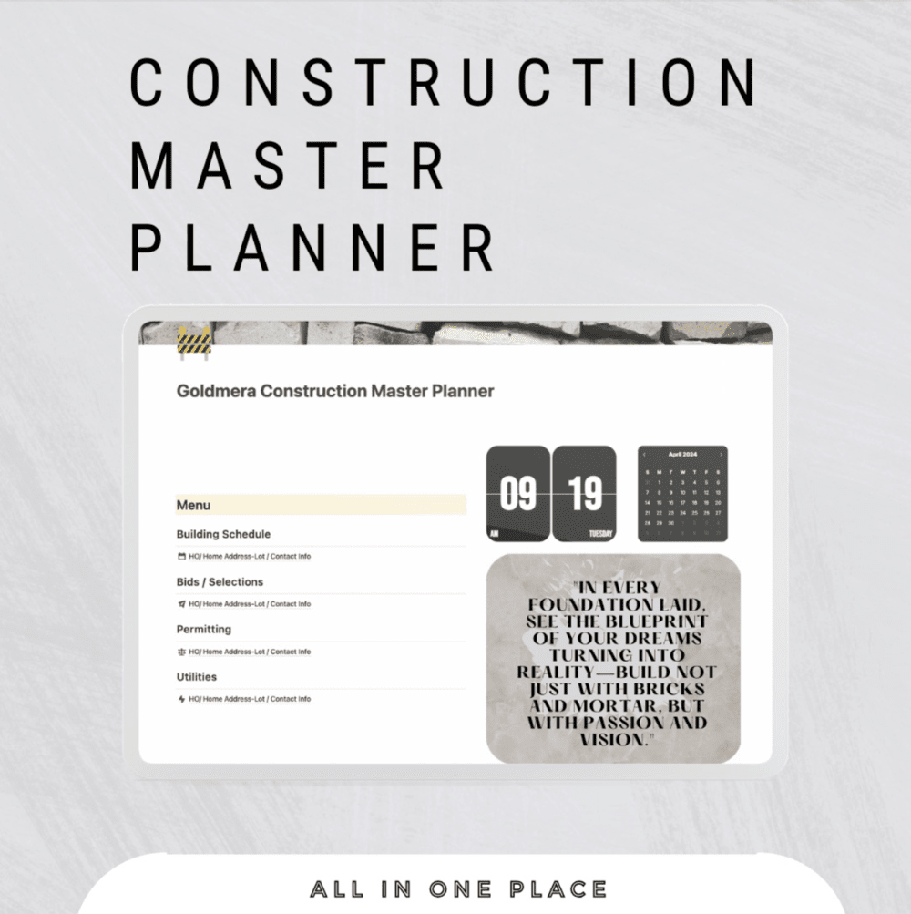Hey there! 🥳 You've just landed yourself in front of the ultimate Construction Master Planner template. This temple stems from my experience building track homes with Lennar to local luxury homes. This tool is all about making your project planning and execution a breeze. With features like Gantt charts, and all the planners you need (bidding, permits, you name it!), it's fully customizable to fit your project perfectly. 🚀