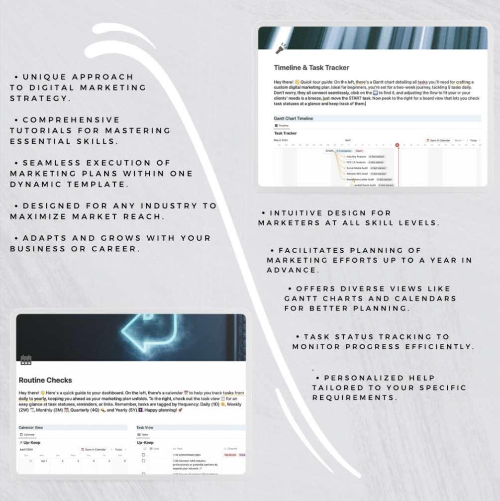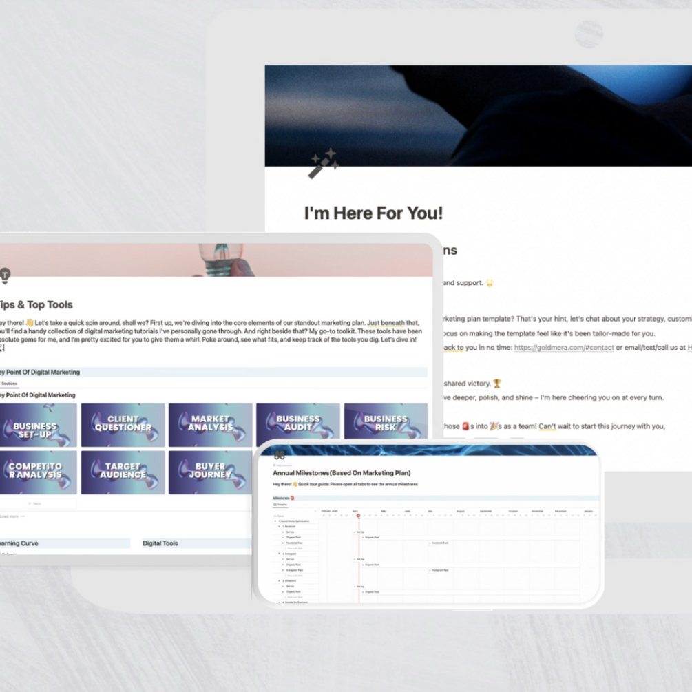Hey there! 🥳 You've just landed yourself in front of the ultimate digital marketing template. Drawing from years of industry experience, this toolkit is your one-stop shop for scaling your marketing game. From unique strategy approaches and comprehensive tutorials to intuitive designs and personalized support— we've got it all. Whether you're plotting your next year's marketing efforts or tracking task progress, this template adapts and grows with you, for any industry. 🚀